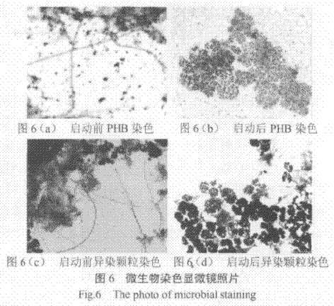 当启动成功后,厌氧段有大量的蓝黑色聚合体产生,说明厌氧条件下发生了明显的合成PHB的反应,在好氧段,大量的黑色密实聚磷颗粒,细胞群落清晰可见。此时,结合系统的氮磷去除效果,分析认为,聚磷菌已经成为系统的主导菌群。