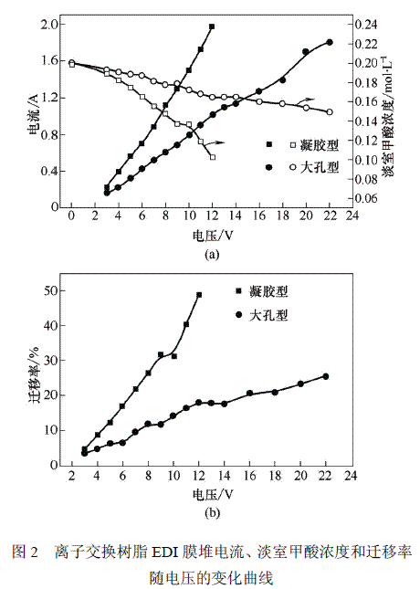 改变EDI膜堆的操作电压,从3V开始,逐步增大电压,等待一定时间,当膜堆达到稳定状态时,记录膜堆在不同操作电压下的电流以及浓室、淡室pH值等参数值,同时取10mL淡室溶液待测定其浓度。甲酸溶液采用标准NaOH溶液以酚酞为指示剂滴定。
