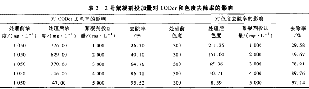 制备的该絮凝剂中,Si/Fe/A1的摩尔比为0.6:1:2。2号絮凝剂投加量对CODcr和色度去除率的影响示于表3,由表3可见,当废水中加药量为5000mg/L时,出水CODcr为47.00mg/L,去除率达到95.52%,色度为8.59倍,脱色率达到97.14%。