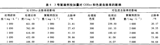 制备的该絮凝剂中,Si/Fe/A1的摩尔比为0.6:1.5:1.5。3号絮凝剂投加量对CODcr和色度去除率的影响示于表4,从表4可以看出,在加药量为5000mg/L时,废水CODcr为106.00mg/L,去除率为89.90%,色度为16.07,脱色率为94.64%。