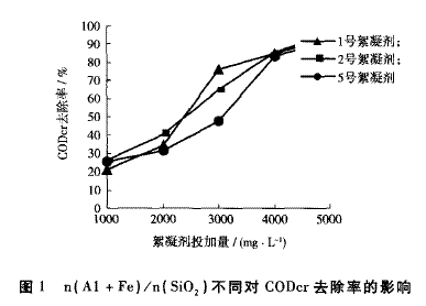 由图3可见,以上三种絮凝剂中,2号絮凝剂的处理效率明显优于5号絮凝剂,总体上也优于1号絮凝剂,且2号絮凝剂稳定性较高,处理效果也比较稳定。故选取2号絮凝剂的配比为较佳配比。即采用n(Al+Fe):n(SiO)=10:2时所制得的絮凝剂对CODcr的去除效率较高。