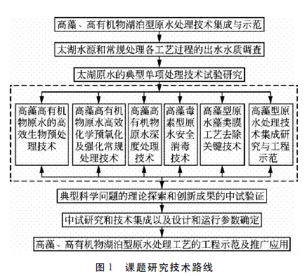 本课题针对太湖水面临的高藻、高氨氮、高有机物污染等饮用水安全问题开展试验研究,首先对高藻型湖泊原水的高藻、藻毒素、臭味物质、微量有机污染等问题进行单项技术研究,在此基础上,开展中试组合工艺研究,完成具有高藻湖泊型原水污染特征的处理技术集成,并选择典型示范水厂进行综合工程示范,形成针对高藻型湖泊原水用水安全的技术保障体系,示范工程6个月以上的运行数据表明,出厂水水质达到国家标准,具体技术路线见图1。