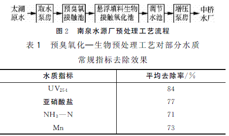 预臭氧化-生物预处理工艺形成的耦合预处理技术已经应用于示范工程南泉水源厂的原水预处理,工艺流程见图2。该工艺对部分水质常规指标的去除效果见表1。