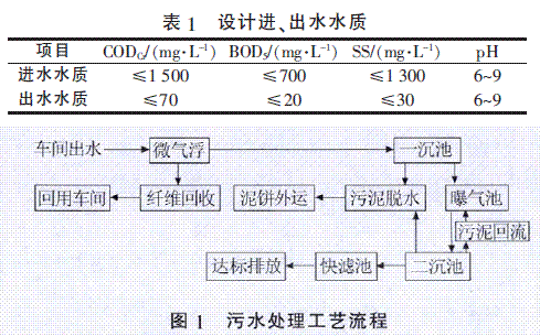 该纸厂生产能力可达300t/d,全厂每日产生废水总量为10000m3,经系统处理后达标排放。设计进水和出水水质见表1,工艺流程如图1所示。