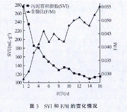 采取以上措施一段时间后,进曝气池的污水黏度减小,曝气池内泡沫明显减少,不再覆盖整个池面,MLSS降低,污泥沉降性能变好,二沉池出水明显改善,污泥膨胀基本得到控制。截至7月20日,MLSS为2100mg/L,二沉池出水COD下降到60mg/L左右。图3为7月5日到7月20日的SVI和F/M变化情况。