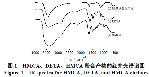 (1)以DETA、CS2、环氧氯丙烷和NaOH为原料合成了一种重金属离子螯合剂HMCA,红外光谱图表明HMCA分子中已成功接入─CSS−;基团。