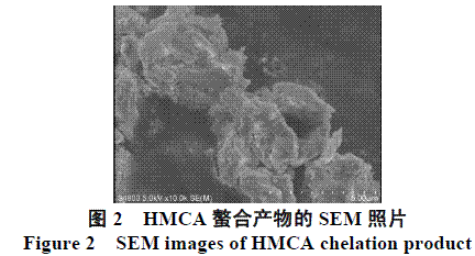 HMCA与Cr(III)形成的螯合产物的SEM照片见图2。由图2可以看出,HMCA螯合产物呈大小不等、不规则的致密颗粒状,表面出现的小絮体堆积成大的絮体,说明HMCA与Cr(III)形成稳定的沉淀物。