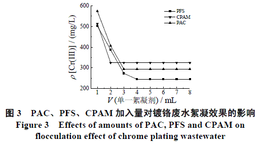 PAC、PFS、CPAM的加入量对镀铬废水的影响见图3。由图3可知,随着PAC、PFS、CPAM加入量的增大,Cr(III)的质量浓度均呈下降趋势,当投入量达到一定值时,Cr(III)的质量浓度降至最低,继续增大絮凝剂加入量,Cr(III)质量浓度不再改变。