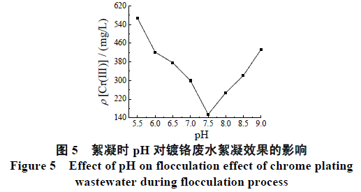 絮凝时废水pH对Cr(III)质量浓度的影响见图5。由图5可知,随废水pH不断增大,废水中Cr(III)的质量浓度逐渐减小;当废水pH为7.5时,Cr(III)的质量浓度最低;继续增大废水pH,Cr(III)的质量浓度又逐渐增大。故复合絮凝的最佳pH为7.5.