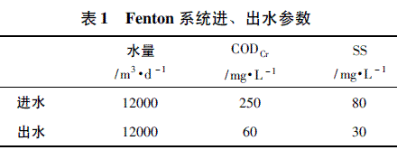 根据河南银鸽提供的中段水相关资料,对Fenton氧化系统进行设计,设计的Fenton系统进、出水参数如表1所示。