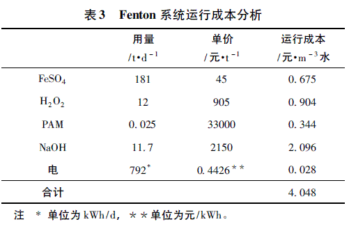 Fenton系统的日常运行成本主要由电力消耗、化学品消耗构成。河南银鸽Fenton系统调试成功后,经过1个月的试运行,根据各种消耗数据,按平均每天废水处理量1.2万m3计,吨水的运行成本如表3所示。