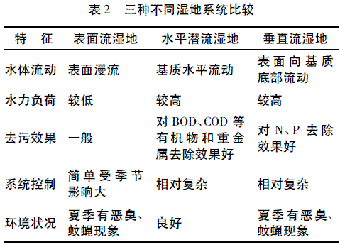 按照植物种类、床体布水方法或水流方式的差异,一般可将人工湿地分为表面流湿地(SurfaceFlowWetland,SFW)、水平潜流湿地(SubsurfaceFlowwetland,SSFW)、垂直流湿地(VerticalFlowWetland,VFW)。如图1所示,三种不同人工湿地系统构造、水流方式、床体构造等方面明显不同,它们在对污染物的处理方面也是各有优缺点(见表2)。