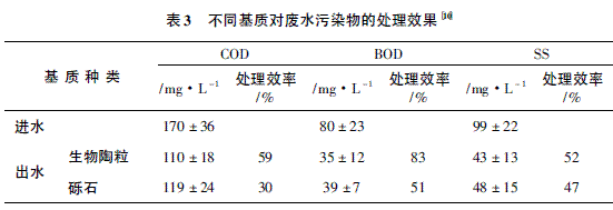 人工湿地所用基质的种类主要有:土壤、砂子、砾石、碎瓦片、矿物、粉煤灰、泥炭、有机物料以及工业副产品如炉渣、钢渣、煤渣和粉煤灰等。无烟煤在处理污水中有机物方面具有很好的效果,沸石比较适合做含氮量较高的污水的处理基质,而钢渣则适合用于含磷量高的污水的处理基质。T.Y.Chen等在实验中对比了一种新型生物陶粒和砾石对废水污染物的处理效果(见表3)。生物陶粒的处理效果要明显优于砾石,原因在于生物陶粒的表面积(2360m2m-3)要比砾石(990m2m-3)大,表面能附着更多的微生物。