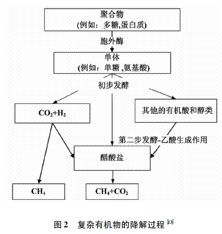 废水中的有机物还包括一些复杂的生物高分子混合物。其中一些有机物,如蛋白质、糖类和脂类等,能很容易地被微生物分解为单体;但其他的一些有机物,如木质素、半纤维素等,较难被微生物分解。废水中这些复杂的生物高分子有机物的分解是一个多步反应过程。如图2所示,高分子聚合物(多糖、蛋白质等)在微生物胞外酶的作用下先被转化成一些单体,如单糖和氨基酸等,然后又经过发酵转变为二氧化碳和氢气还有一些被转化成其他的有机酸和醇类,最后在乙酸生成的作用和二次发酵的作用下,最终变成了甲烷和二氧化碳。