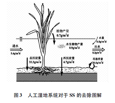 在人工湿地系统中,废水中悬浮物(SS)的去除主要是依靠系统中的物理沉降和过滤来完成的。在湿地系统中,分布了大量的植物根系,并且基质也处于饱和状态,此时当SS随着污水进入系统时,会被根系和填料阻挡和截留。特别的在水平潜流人工湿地系统中,此时的系统更类似于一个水平或垂直的重力过滤器,通过在基质和根区面的生物膜进行重力沉淀(重力沉淀和絮凝)、渗透和吸附作用去除SS。多项对比实验表明,有植物的人工湿地系统其对SS的去除率明显高于无植物的对比实验系统,甚至相当于无植物系统的两倍。图3显示了湿地系统对于SS的去除过程。进水口SS的浓度为5.4g/m2.d,而经过系统的过滤和植物的吸附作用后,出水口的SS浓度变成了0.3g/m2.d。