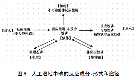 人工湿地对总磷的去除作用包括基质的吸附、过滤、沉淀、植物吸收、微生物去除及物理化学作用。图5给出潜流湿地磷反应成分、形式和途径的概念模型。
