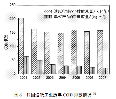 造纸工业废水年排放量为49亿吨,占全国工业废水排放总量的17%,COD排放量占全国工业废水排放总量的32%。2001年至2007年间,虽然我国造纸工业产量增长迅速,但COD排放总量却没有增加,单位产品COD排放量逐年下降(见图6),这说明造纸工业在节水减排方面的工作取得初步成效。然而,我国造纸工业单位产品的水资源消耗、污染物排放量仍然处于较高水平,与西方国家造纸工业相比,存在较大的差距。2011年7月1日,我国造纸工业将开始执行水污染物排放新标准(GB3544-2008)。与2001颁布的排放标准比较,新标准在单位产品基准排水量及CODcr、BOD5、总磷、总氮、AOX等排放浓度指标提出了非常严格的要求。随着新标准的执行,造纸企业在污染治理方面面临空前的压力和挑战,纷纷采取措施,或开工建设新的废水处理系统,或对原有污水处理系统进行改造,以期达到新标准对水污染物的排放要求。