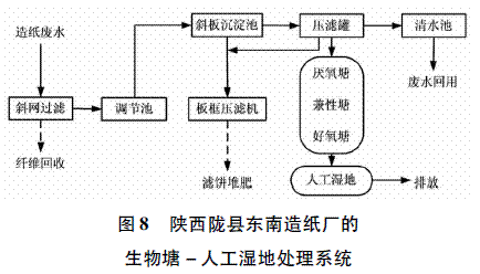 陕西陇县东南造纸厂的生物塘-人工湿地处理系统,建于2000年,工程总投资100万元,运行费用为0.9元/m3,系统出水达到了当时得排放标准(GB3544-2001)。该企业以麦草为原料,采用亚氨法或石灰法制浆造纸工艺,生产本色包装纸、高强瓦楞纸。工厂原水经过60目斜网去除纤维后进入调节池,通过泵前加入石灰乳和少量助凝剂并在斜板沉淀池沉淀分离,后经压滤,清水回用,剩余废水(约为原水的50%)进入生物塘-人工湿地系统,处理流程见图8。系统设计参数如下: