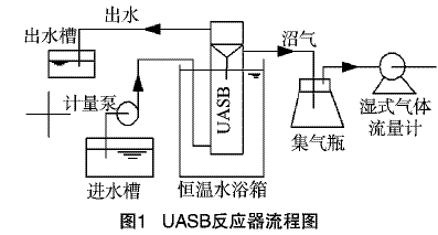 反应器中接种的污泥取自无锡某柠檬酸厂IC反应器的颗粒污泥(含水率90%,密度1.2g/L),粒径均匀,呈黑色,接种污泥量15kg/m3,接种的污泥体积占UASB反应器容积的1/3。本试验采用中温厌氧,UASB反应器放在中温水浴箱中,温度控制在(37±2)℃,水力停留时间控制为24h。