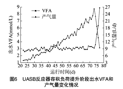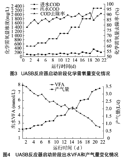 由图3可知,反应器启动初期厌氧微生物活性还没有恢复,化学需氧量去除率较低。随着厌氧微生物活性的逐步恢复,反应器启动12~22d,出水的COD基本在200mg/L以下,COD去除率基本在90%以上。由图4可知,出水的VFA逐渐降到3mmol/L以下,产气量稳步提升。可见经过21d的驯化,UASB反应器中的微生物对该废水有很好的适应,反应器启动成功。