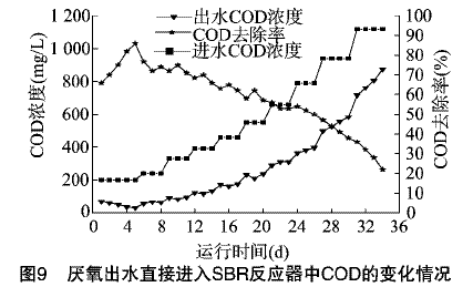 烟草废水经UASB处理后的出水指标为COD为2200mg/L,色度达到1000倍。用SBR反应器处理UASB反应器出水时,首先对SBR反应器中的好氧活性污泥用COD为200mg/L的啤酒废水培养7d,待好氧活性污泥中的微生物活性恢复后加入经自来水稀释的UASB反应器出水,SBR反应器中COD的变化如图9。