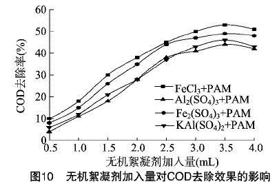 采用4种常用的无机絮凝剂FeCl3、Fe2(SO4)3、Al2(SO4)3、KAl(SO4)2分别加复配PAM,对UASB反应器出水进行物化絮凝试验,上述絮凝剂浓度均为5g/L。由图10可以看出,随着絮凝剂加入量的增加,废水COD的去除率明显上升,当FeCl3、Fe2(SO4)3、Al2(SO4)3、KAl(SO4)2加入量达到3.0mL复配0.5mL的PAM处理后,上清液COD分别为1093、1232、1364、1408mg/L,其去除率分别为50.3%、44.0%、38.0%、32.7%。可见,铁系絮凝剂明显优于铝系絮凝剂。继续增加絮凝剂量,COD去除率上升缓慢且有下降的趋势。