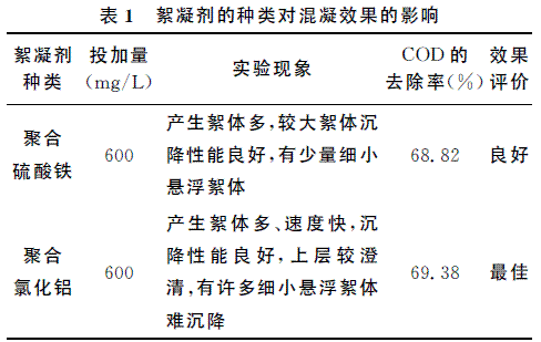 絮凝剂的种类较多,传统应用的无机絮凝剂为铝盐和铁盐。铝盐主要包括氯化铝、硫酸铝和聚合氯化铝(PAC),铁盐主要有三氯化铁、硫酸亚铁和聚合硫酸铁(PFS)。混凝实验研究是在废水经过电解质破乳处理的基础上进行的,因此本实验分别以聚合硫酸铁和聚合氯化铝作为絮凝剂。向废水中加入等量的不同种类的絮凝剂,在相同操作条件下考察破乳除油的效果。实验结果见表1。