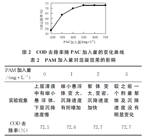 从图2中可以看出,随着絮凝剂投加量的增加,COD的去除率增加,但是当PAC投加量达到500mg/L后,继续增加投药量,COD去除率的增长曲线趋于平缓。确定500mg/L PAC+500mg/L CaCl2,加入不同剂量的PAM观察实验现象,结果如表2所示。