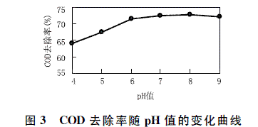 确定在500mg/L PAC+500mg/L CaCl2+2mg/LPAM的条件下,pH值影响COD去除率的变化曲线如图3所示,可以看出,该复合絮凝剂pH值在6~8的范围内均具有较好的混凝性能。