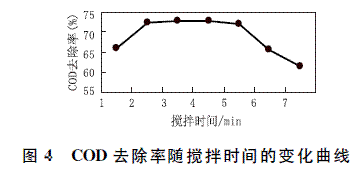 确定500mg/L PAC+500mg/L CaCl2+2mg/LPAM,调节pH值到7.0,快速搅拌1min,慢速搅拌时间影响COD去除率的变化曲线如图4所示,可以看出,慢速搅拌时间对混凝效果的影响比较大,搅拌时间过长或者过短都不利于混凝作用。混凝的搅拌时间以2~4min为宜,超过5min后COD去除率开始下降。
