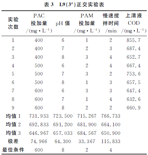 以上实验只能说明单一因素对混凝结果的影响,不能清晰地表明COD去除率在4种因素(PAC投加量、pH值、PAM投加量和慢速搅拌时间)共同作用下的影响。正交实验能用最少的实验次数得到最优的解决方案,故采取正交实验的方法,对上述4种因素的影响进行评价,实验设计及结果分析见表3。