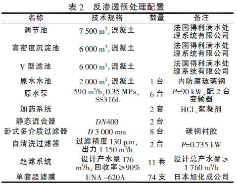 预处理工艺由高密沉淀池+V型滤池+多介质过滤器+自清洗过滤器+超滤组成。工业废水进入高密沉淀池和V型滤池后,其中的胶体和悬浮物很多被去除掉,水由非常浑浊变得澄清;之后进入卧式多介质过滤器,为后续的超滤系统提供了稳定水质;超滤系统是反渗透预处理的最后一道屏障,由于超滤对悬浮物(>0.2μm)的去除率达到100%,产水的SDI<3,保证了反渗透系统的进水要求。表2为反渗透预处理具体配置情况。