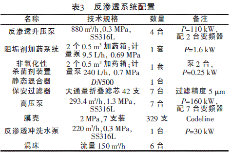 反渗透是水处理系统中脱盐的核心,反渗透膜可除去水中绝大部分可溶性盐以及全部的胶体和微生物,为后续的混床工艺提供优质水源。反渗透系统主要包括反渗透升压泵、保安过滤器、高压泵、反渗透膜堆,此外还包括阻垢剂加药系统(确保反渗透系统在无垢情况下稳定运行)和非氧化性杀菌剂加药系统(确保反渗透系统无菌),以及反渗透清洗系统及自动控制部分。反渗透系统的配置详情见表3。