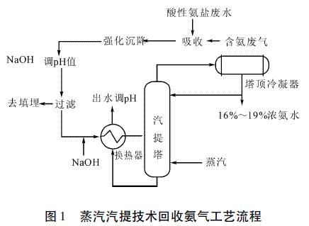 蒸汽汽提技术回收水中氨的物理化学原理为氨与水分子相对挥发度的差别较大,氨水混合物在精馏塔内进行数十次气液相平衡,氨形成气态形式与液态水分离,同时氨气以氨水或液氨的方式进行回收。工艺流程见图1。