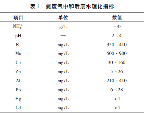 金堆城钼业股份有限公司钼酸铵生产过程中产生的废水经过氨废气中和吸收后的理化指标见表1。