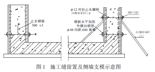 渠道底板、侧壁、顶板模板均采用定型复合木模板,支撑及加固体系采用钢管、木方并配φ12mm防水对拉螺栓。渠道侧壁支模方法如图1所示。