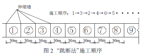 按纵向分段的跳段方法组织施工,每段长度为30m,相连两段接口按伸缩缝处理,中埋橡胶止水带。