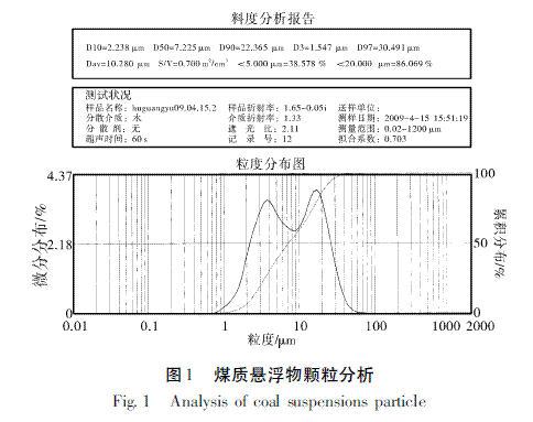 úÄàË®ÖÐËùº¬¿ÅÁ£Á£¶ÈµÄ·Ö²¼¶Ô´¦ÀíЧ¹û¾ßÓнϴóÓ°Ï죬һ°ã´óÓÚ75¦ÌmµÄ¿ÅÁ£×´ÃºÄà½ÏÒ׳Á½µ¡¢ÍÑË®ºÍ¾«Ñ¡¡£Ð¡ÓÚ75¦ÌmµÄ΢ϸúÄà¿ÅÁ£º¬Á¿¸ßµÄúÄàË®´¦ÀíÄѶȴó£¬ÃºÄà¿ÅÁ£µÄÁ£¶È·Ö²¼£¬ÓÈÆäÊÇ΢ϸ¼¶µÄº¬Á¿£¬¶ÔúÄàË®µÄ´¦ÀíÓÐמö¶¨ÐÔµÄÒâÒå¡£Òò´Ë£¬ÔÚÈ·¶¨´¦Àí·½°¸Ö®Ç°£¬Ê×ÏÈÓ¦¶ÔúÄàË®µÄÁ£¶È·Ö²¼Çé¿ö½øÐзÖÎö¡£Á£¶È·Ö²¼Çé¿ö²ÉÓÃÁ£¶È·ÖÎöÒDzⶨ¡£´Óͼ1¿´³öËùÓеĿÅÁ£¶¼ÔÚ75¦ÌmÒÔÏ£¬Ð¡ÓÚ5¦ÌmµÄ¿ÅÁ£¸÷Õ¼45.21%¡¢38.578%ÇÒÁ£¶È·Ö²¼Ïà²î²»´ó¡£ÓÉ˹ÍпË˹¹«Ê½ÖªµÀ³Á½µËٶȺÍÁ£¾¶µÄƽ·½³ÉÕý±È£¬ËùÒÔÑ¡ÓõÄÐõÄý¼Á·Ö×ÓÁ¿Òª´ó¡£