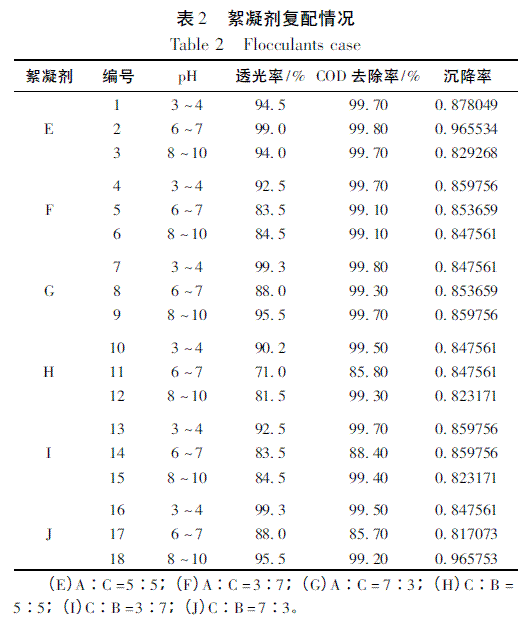 ʵÑéÊ×ÏÈͨ¹ý¿ØÖÆÒõÀë×Ó¾Û±ûÏ©õ£°·ÓëÑôÀë×Ó¾Û±ûÏ©õ£°·¸´Åä±ÈÀý£¬ÔÚ²»Í¬pHÏ£¬²â¶¨¸´ÅäºóµÄÐõÄý¼Á¶Ôϴú·ÏË®µÄ´¦ÀíÇé¿ö¡£ÒÔ±í2ΪÒõÀë×Ó¾Û±ûÏ©õ£°·ÓëÑôÀë×Ó¾Û±ûÏ©õ£°·¸´Åä¾ßÌåÇé¿ö¡£