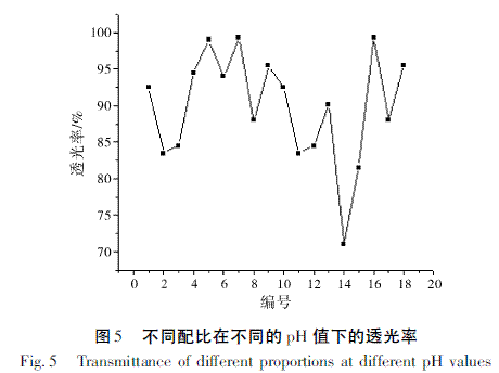 ÓÉͼ5¿ÉÒÔÃ÷ÏÔ¿´³ö£¬¸´ÅäºóµÄÐõÄý¼Á´¦Àí¹ýµÄ·ÏË®µÄ͸¹âÂÊÆÕ±é¶¼ÔÚ90%ÒÔÉÏ£¬½ÏÐõÄý¼Áµ¥¶ÀʹÓÃʱÓÐÃ÷ÏÔÌá¸ß¡£Òò´Ë˵Ã÷ÔÚ͸¹âÂÊ·½ÃæÐõÄý¼Á½øÐи´Åä¿ÉÐС£¾¹ý±È½Ï£¬±àºÅ16µÄ͸¹âÂÊ×î¸ß£¬pHΪ3¡«4¡£Í¬Ê±¿´³öÔÚËáÐÔ»·¾³ÖÐÐõÄý¼Á¸´Åä͸¹âÂÊÌá¸ß·½Ãæ±ÈÖÐÐÔ¼°¼îÐÔ»·¾³ÖÐЧ¹ûºÃ¡£