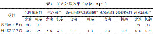 从表中可见,采用本工艺处理油田污水能够达到低渗透油层回注水标准(含油10mg/L,机杂10mg/L),各项指标都能达到相关要求。出水效果好主要在于气浮处理技术的应用。通过应用气浮使污水中含油和悬浮物浓度明显降低,特别是去除了污水中小颗粒的悬浮物和溶解油。同时本工艺通过改善前处理工艺流程,有效提高了气浮处理工艺出水水质,从而有效解决了改性纤维球过滤器技术在油田废水应用中存在的滤料污染问题,延长了改性纤维球的使用寿命。