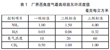 城市污水来源复杂,成分复杂,含有较多的气味气体,主要有含硫化合物,如H2S、SO2、硫醇类和噻吩类;含氮化合物,如NH3、胺类等;烃类化合物,如烷烃、烯烃、芳香烃等;含氧化合物,如醇、醛等。这些气体的挥发对周围产生较难闻的恶臭,对空气产生污染。表1列出了GB14554—93恶臭污染物排放标准对恶臭污染物做出的厂界最高允许浓度值。