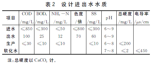 考虑可能产生的不可预见废水量,设计日处理量为3 600m3/d的污水处理系统,设计进出水水质如表2所示。污水经集中处理后作为企业的中水水源全部再生回用,根据企业生产用水的性质和功能要求,其水质要分别达到企业内部规定的软化水水质标准和生产新水水质标准;经过膜系统分离后产生的浓盐水应处理后达到《纺织染整工业水污染物排放标准》(GB 4287-2012)企业直接排放要求。