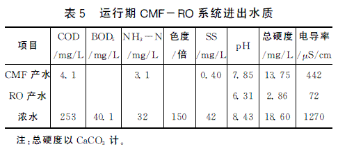 CMF-RO系统运行效果见表5。混凝沉淀池出水进入CMF和RO系统后,各类水质指标都有较好的去除效果,生产新水由CMF产水和RO脱盐水混合调配而成,可满足不同用水需求。特别是膜对于SS的截留作用,使SS去除率达到99.6%。