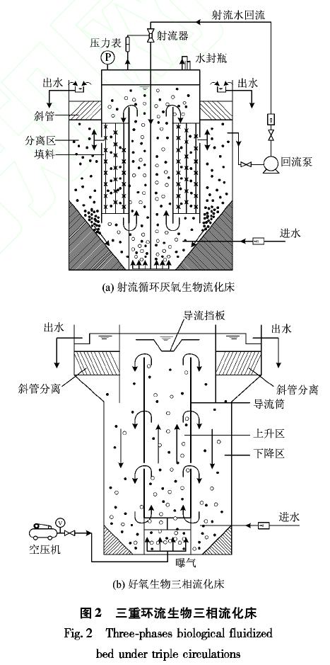 韦朝海等针对该类工业废水自行开发了新型流化床工艺———三重环流生物三相流化床(图2),并成功运用到12个工程项目中,处理废水CODCr、BOD5容积负荷可达3.4和1.7kg(m3.d),去除率分别可达95.4%和95.1%。Kim等将生化法与物理法进行组合,在生物流化床工艺后面添加化学混凝沉淀及电化学氧化工艺,并优化了其操作条件。该工艺组合使生物流化床CODCr和色度的去除率分别提高了25.7%和20.5%,组合工艺最终可去除95.4%的CODCr和98.5%的色度。