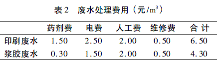 运行费用见表2,1m3浆胶废水的药剂费、电费、人工费合计为6.50元,1m3印刷废水的药剂费、电费、人工费合计为4.30元,每天总运行费用194元。处理后的浆胶废水全部回用后,日节省自来水30m3,则总运行费用降低三分之一。本工程吨水处理费用为4.30~6.50元,由于废水总量低,本工程日运行费用相当低廉。