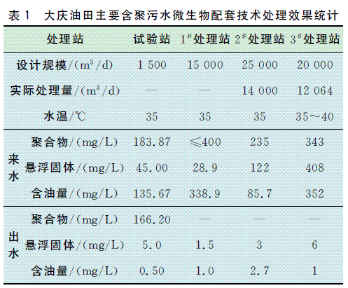随着工艺的逐步改进,微生物配套技术对含聚污水的处理效果越来越好,大庆油田主要含聚污水微生物配套技术处理效果统计见表1。