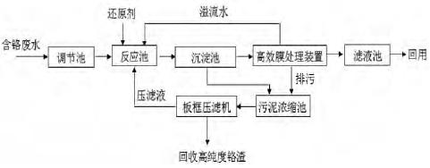 整套含铬废水高效膜处理新技术系统由含铬废水预处理(调节、反应、沉淀)、高效膜处理装置、板框收渣三大部分组成。处理工艺图如下: