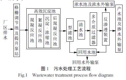 厂区排水先经过粗格栅去除大块污染物后,在重力流作用下流入调节池,在这里可将不同生产工艺排出的不同水质、水量的污水进行混合均匀,减少了水质及水量的波动,从而减少对后续处理构筑物的冲击。污水经过调节池后被提升进入到高效沉淀池,高效沉淀池由前混凝反应池、絮凝沉淀池、沉淀-浓缩池和后混凝反应池组成,污水经絮凝池后,使水中杂质形成细小矾花后进入到絮凝反应池进行反应,再经过沉淀-浓缩池进行泥水分离,并对沉淀污泥进行浓缩。泥水分离后,污水进入后混凝反应池,向池内投加混凝剂来提高后续滤池的过滤效果,同时投加硫酸以中和污水的pH。污水经滤池过滤后,一部分出水进入到回用水池,另一部分作为深度处理的原水进入到深度处理单元。经清水池后污水进入到多介质过滤器,使悬浮颗粒物质得到进一步去除,同时减轻对后续处理设备的负荷。多介质过滤器出水进入到反渗透装置中,通过反渗透膜,去除水中绝大部分的盐分及大分子有机物。污水经反渗透装置后,部分进入产水池,另外一部分进入到回用水池与V型滤池的部分出水进行混合,该池内的水可通过回用水外输泵供给车间生产使用。