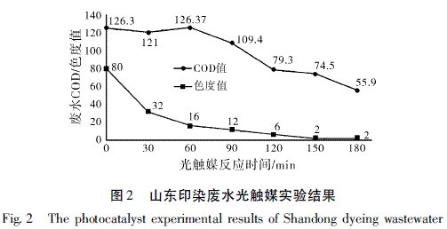 可见,光触媒反应0.5h时,随着光触媒反应时间的加长,该废水的COD与色度均有不同程度的下降;当光触媒反应时间为1.0h时,色度降至8倍,COD降至78.2mg/L;当光触媒反应时间为2.0h时,色度不再变化,而COD值降至47.2mg/L。